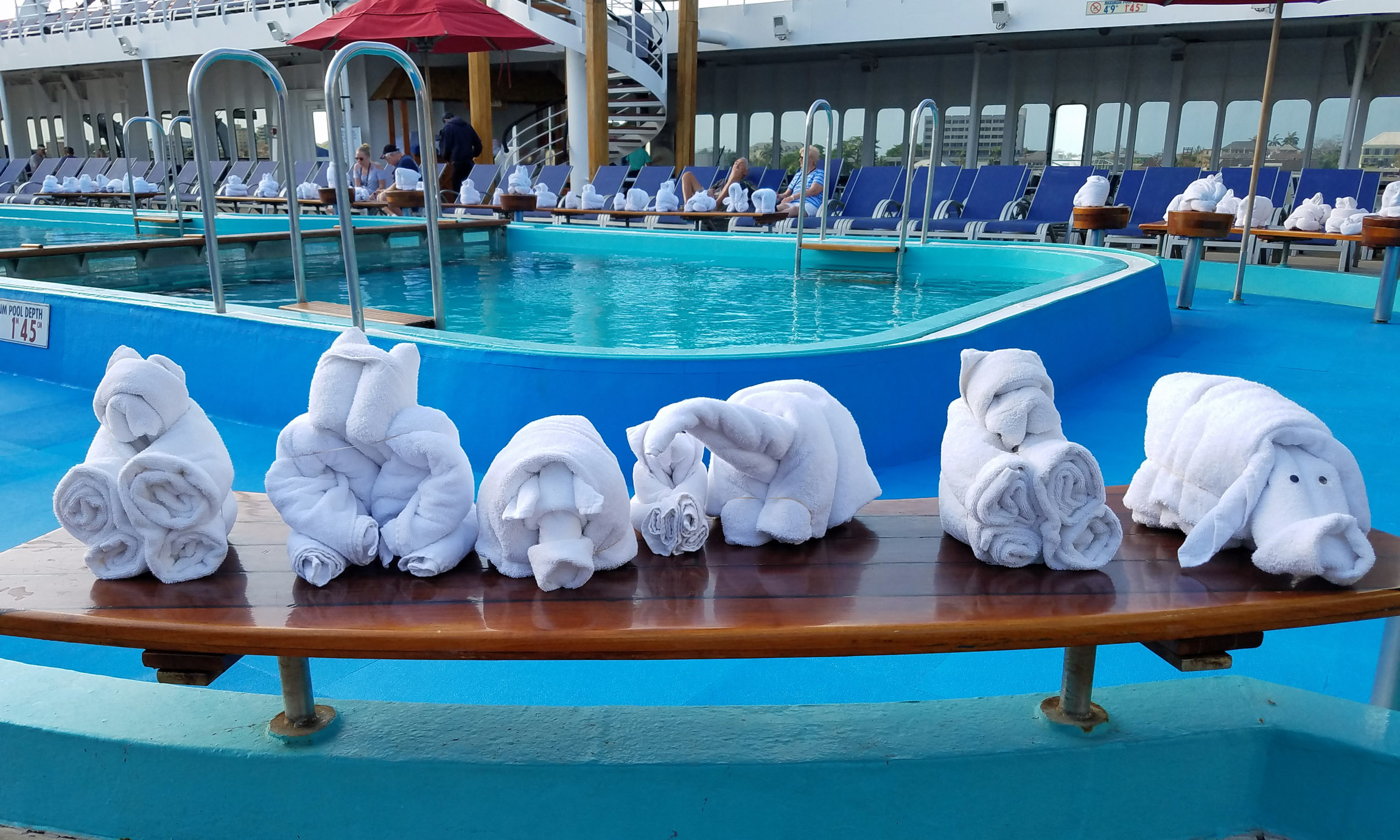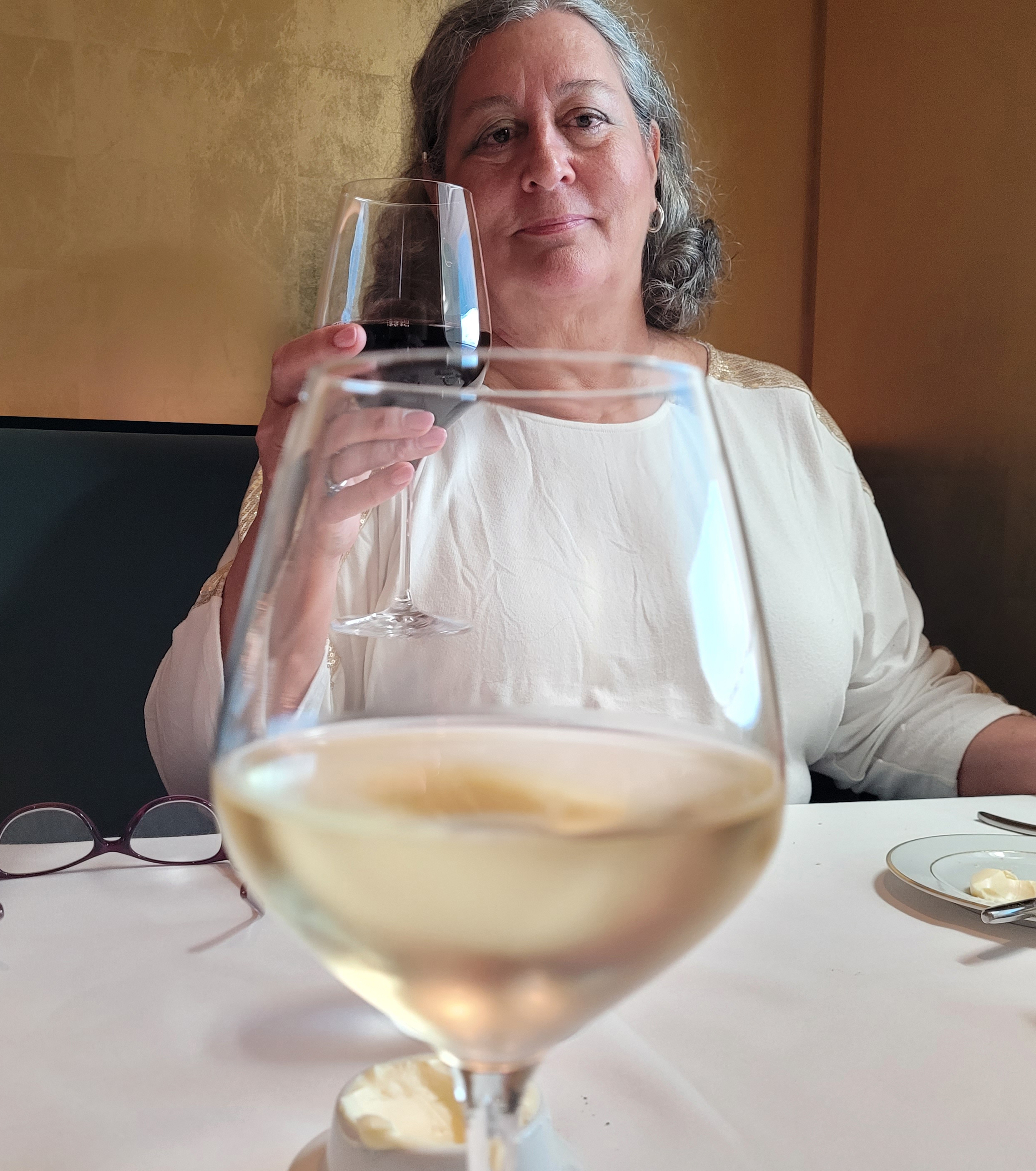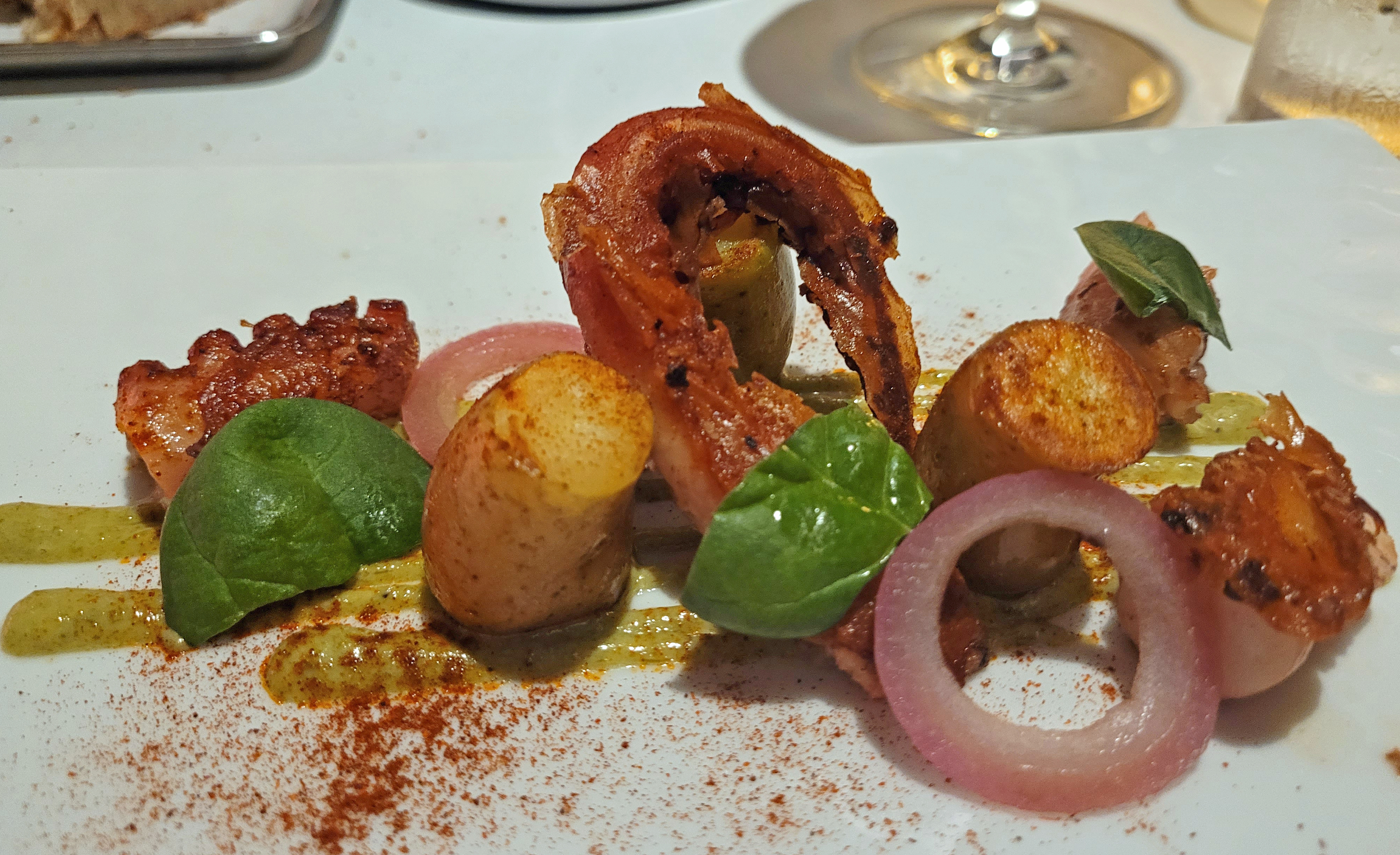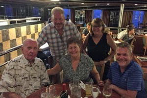 Speaking of luggage, our briefing before dinner was all about how to pack up before midnight, followed by a photo review of our week’s cruise adventure. Each of us received a jump drive with the powerpoint slide show to take back with us – and we toasted the entire crew with champagne. Dinner that night was special – a group of 12 of us who had become pretty close on the excursions asked to be seated together for the last night. It was a lot of fun, as we laughed and chatted about the adventures we all just experienced together. The meal was delicious, with most choosing the beef Wellington, while I had grilled octopus (sure hope it wasn’t the one we spotted). If I recall correctly, it was Ena and Al, Andy and Kristy, Carol and Kathy, Judy and Linda, Adam and Janice who joined us for that last meal (which seemed to have bottomless glasses of wine).