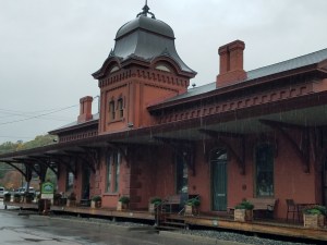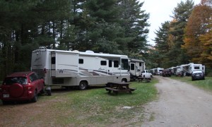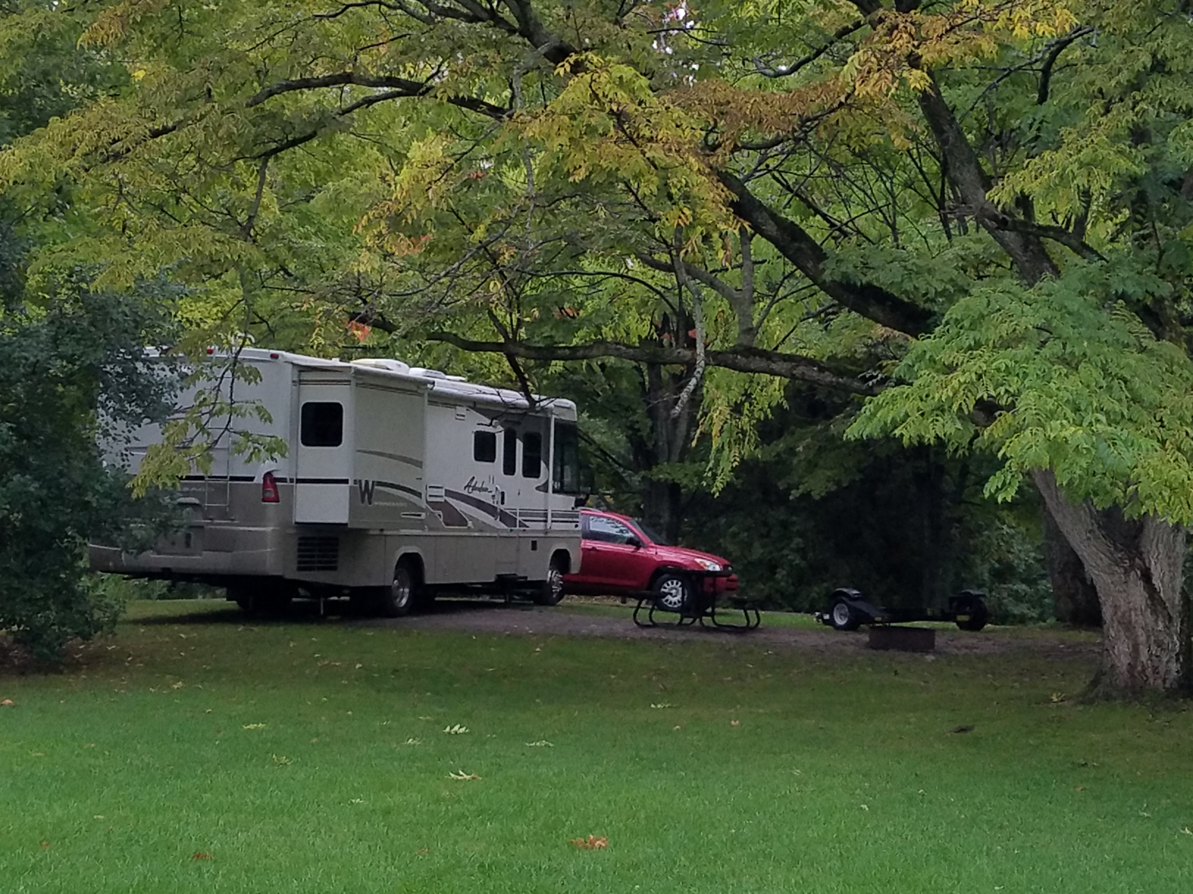 Our route took us across New Hampshire again, just north of the White Mountains and Franconia Notch. But today is an overcast day with intermittent rain and low clouds that obscure the tops of the hills and mountains. But the leaf colors were just vivid orange, red and yellow interspersed with dark green spruce. We did fill the gas tank and found our campground, the Troll Valley Resort. This was kind of a weak link in our reservations, since it seemed a little iffy online. Right location for a mid-point in the drive to Acadia with full hookups, but as we found out — “resort” was stretching it. Jackie asked if the spot was a pull-through. “It can be,” was the reply, and the owner showed us how to just drive across the spot to reach the hookups yet make a drive out without unhitching the car. OK then.