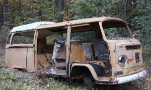 I don’t know why I was complaining, the lounge area had a camper’s library (see the picture and note the lovely bird’s nest), dank bathrooms and showers in the converted garage/basement AND a very well maintained disc golf course. Oh, and I spotted a possibility for our next camper — downsized VW camper that needs just a bit of work.