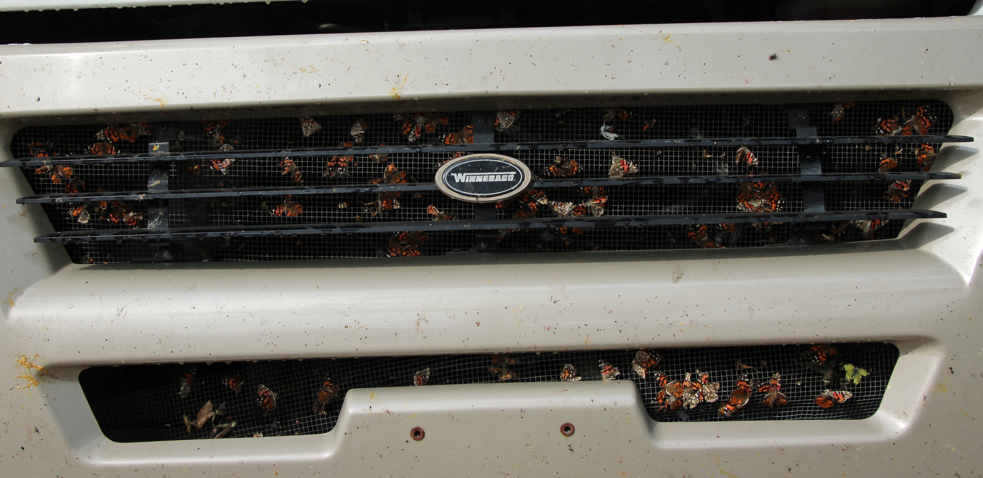 The drive was straight and mostly flat, as you would expect, and very gusty and windy. We were driving a nice 2-lane highway, which gave you a good look at local life. The dry, scrub pastures and high plains of eastern Colorado gave way to irrigated fields of hay, alfalfa and sorghum. It was harvest time for all of that and we saw loads of hay bales in the fields and on trucks, plus sorghum being cut, trucked and massed into huge piles. Trucks of livestock, hay and grains would rush past (speed limit is 65) the motorhome and those with sorghum would splash a blast of grains on the windshield as they passed, quite a jolt. You got a good sense of the scale of work involved in making the harvest of all these crops.