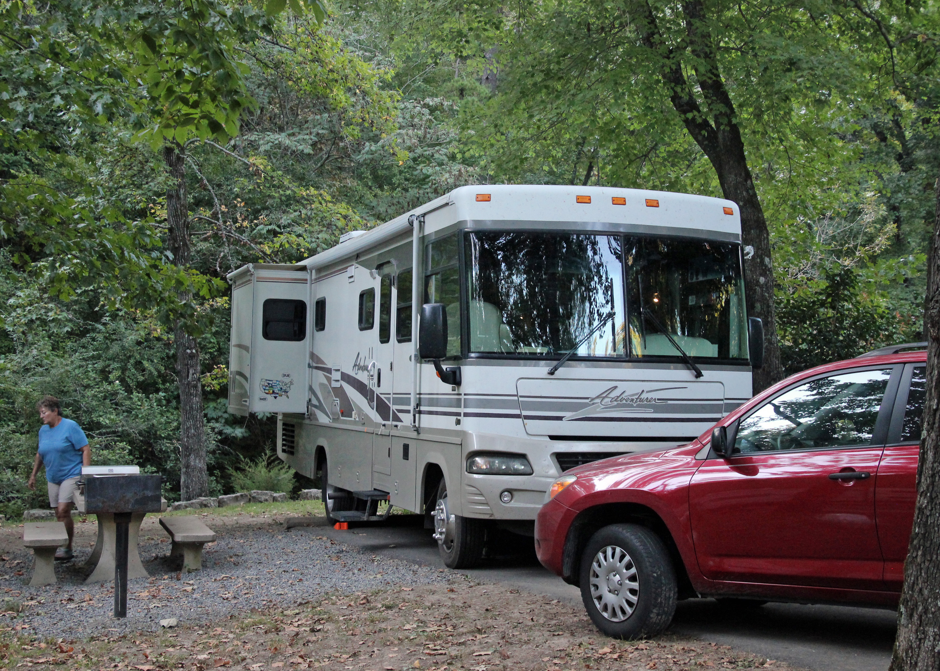Our stop for the night was at Missouri RV Park in Mountain Grove, Missouri just east of Springfield. Actually, for an older park just off the highway it was quite nice. Heck, all we need is a level spot with electric and water, but this had grass and trees and room between sites. Kodi enjoyed some “fetch” for a while and I had time to fix a bucket of soapy water and washed down the Jeep, plus cleaned the bugs off the motorhome windshield. Losing some of the Utah and Colorado dust that is pretty persistent. And Kodi is happy not to be picking up burrs or spikes on his feet. Speaking of dogs and cats, both Kodi and Merlin have been wonderful on the trip. Merlin soaks up the sun on the dashboard (parked) and while on the road, Kodi is great about getting in his crate on the couch and curling up.