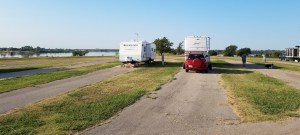 We kept driving east until Wichita, where Jackie called in a reservation inside the city limits at Air Capital RV Park. This was a well-developed spot, all concrete drives with patches of lush green grass between the slips. We asked for a back-in site and at the front office we disconnected the Jeep, ready to follow Melvin in his golf cart. Except that the Jeep would not start again. Tried the instant jump, no good – several times. Took out the jumper cables and hooked to the generator to jump it, not working. By this time we had Melvin looking on, another helpful resident who wanted to jump it from his semi, but it was all to no avail. Battery was dead beyond reviving.
