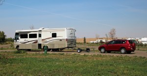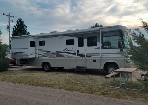 On the nice 2-lane road south again we suddenly saw signs that said “pavement ends” .. what?? Well, one of the area road maintenance strategies is to remove the asphalt from the entire road for miles at a time (5 to 7), leaving a gravel washboard. This was one of those instances as “whomp” we left the pavement and rattled more slowly along the gravel. This is no fun in a motorhome towing a car – everything rattles. After several of these no-pavement stretches we hit Interstate 80 at Rock Springs and kept driving east to reach Rawlins, Wyoming, stopping at a KOA to hook into wifi, cable TV and to check on the progress of hurricane Irma.