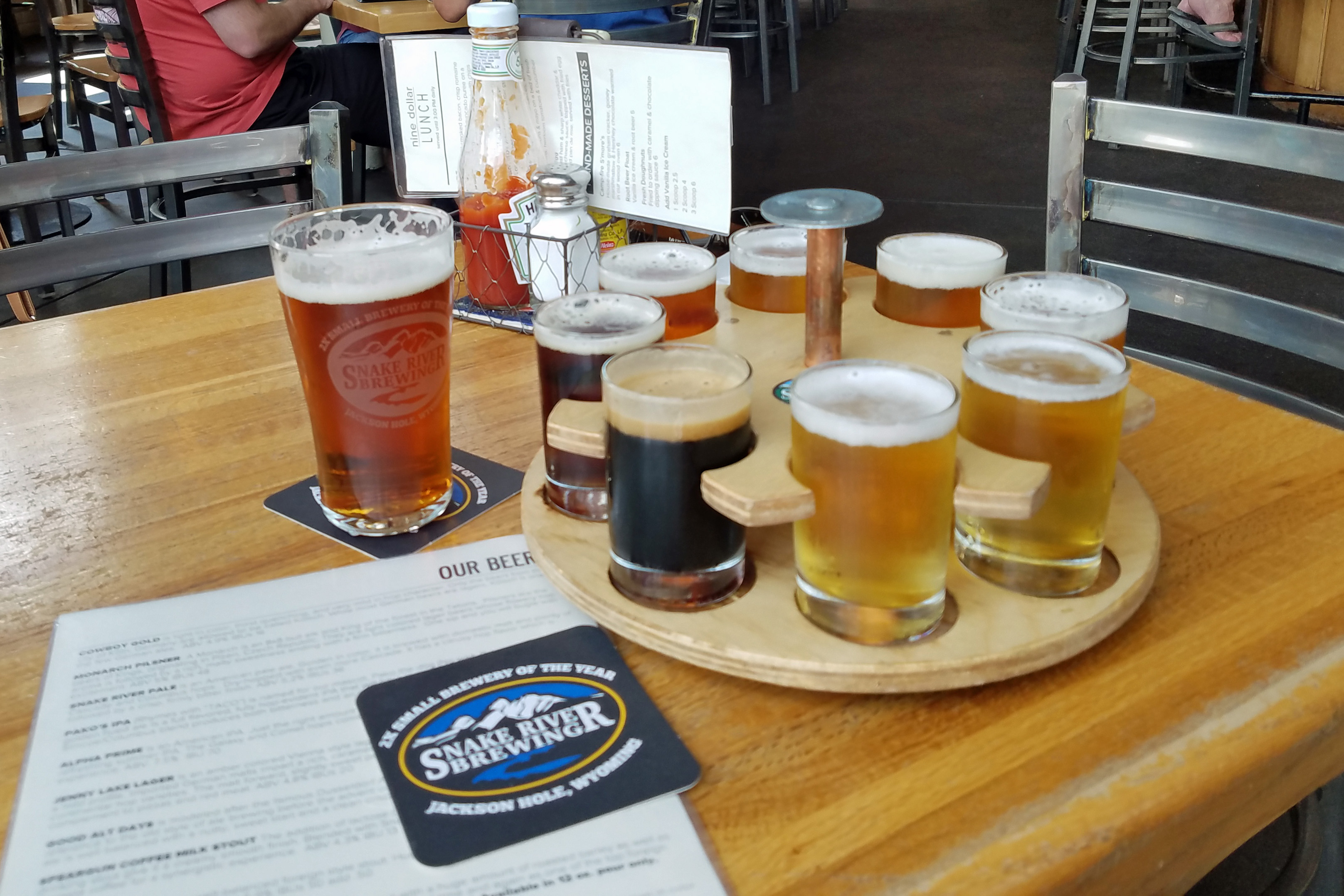 We left those impressive mountains of Grand Tetons while the air was clearing just a bit and we saw them one last time. The drive southeast took us along the Hoback River through a very scenic canyon and then into the cute western town of Pinedale. The streets were wide, the shops all fishing and hunting themed and … woah, was that a brewery we just passed? What luck, it was lunchtime! We eased alongside the sidewalk, parked the van and walked back to Wind River Brewing for a delicious lunch of brats, reuben sandwiches and a flight of beer. One stand-out was their Mango Wheat, which they unfortunately did not have in cans to-go. Darn.