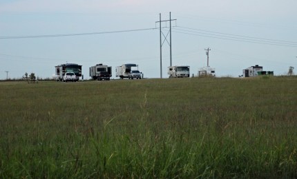 We crossed into Oklahoma, another new state for us, and found an odd city park along a lake just off Interstate 35 north of Oklahoma City. The city of Perry had this grassy bluff of 10 pull-through campsites, full utilities, on a pay-at-the-box basis. What fun – just four of us there for the night, listening to cows in the distance and looking up into a dark night sky. Oklahoma has very few trees, too. Mostly grasslands and cropland, but you sure can see the horizon easily.